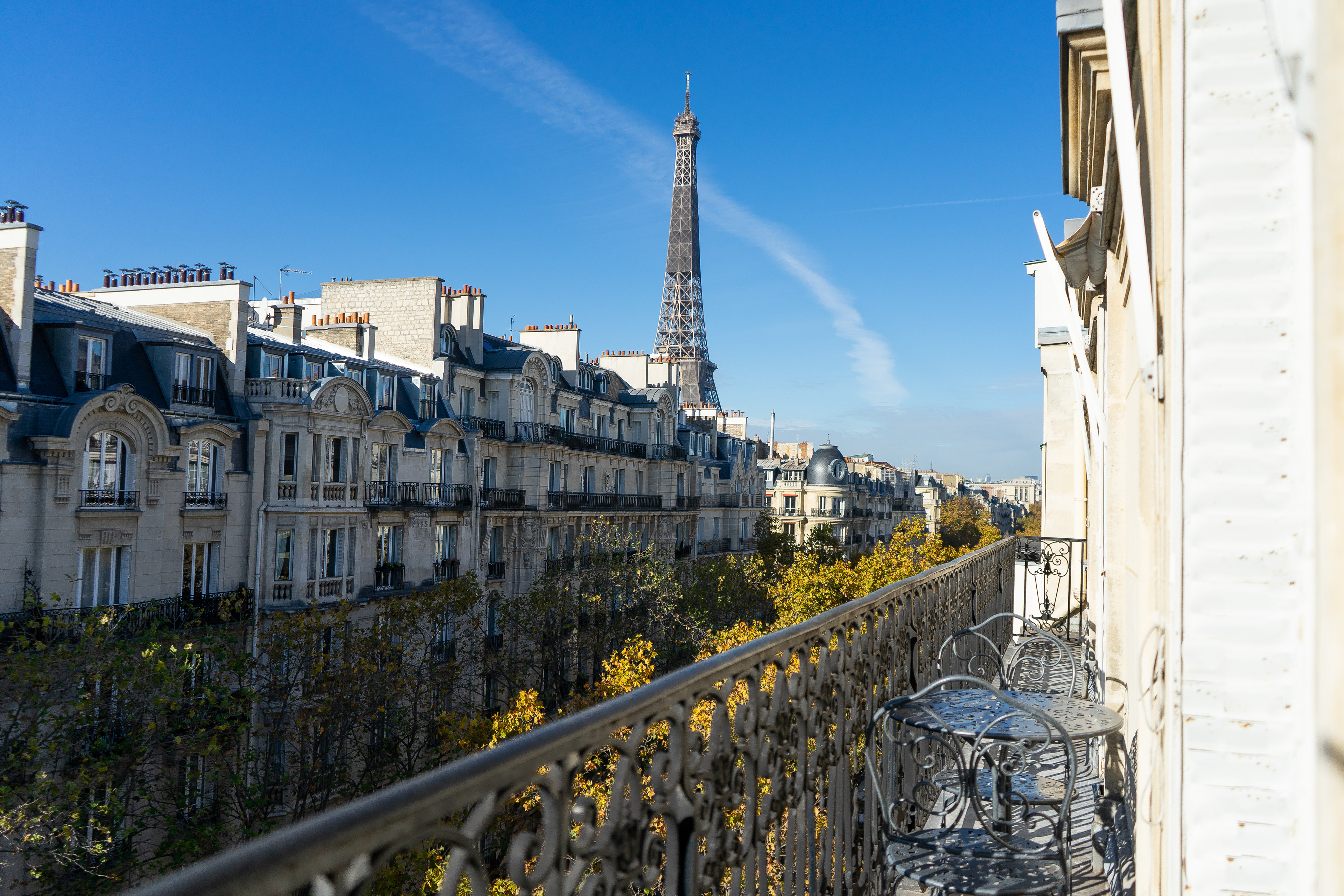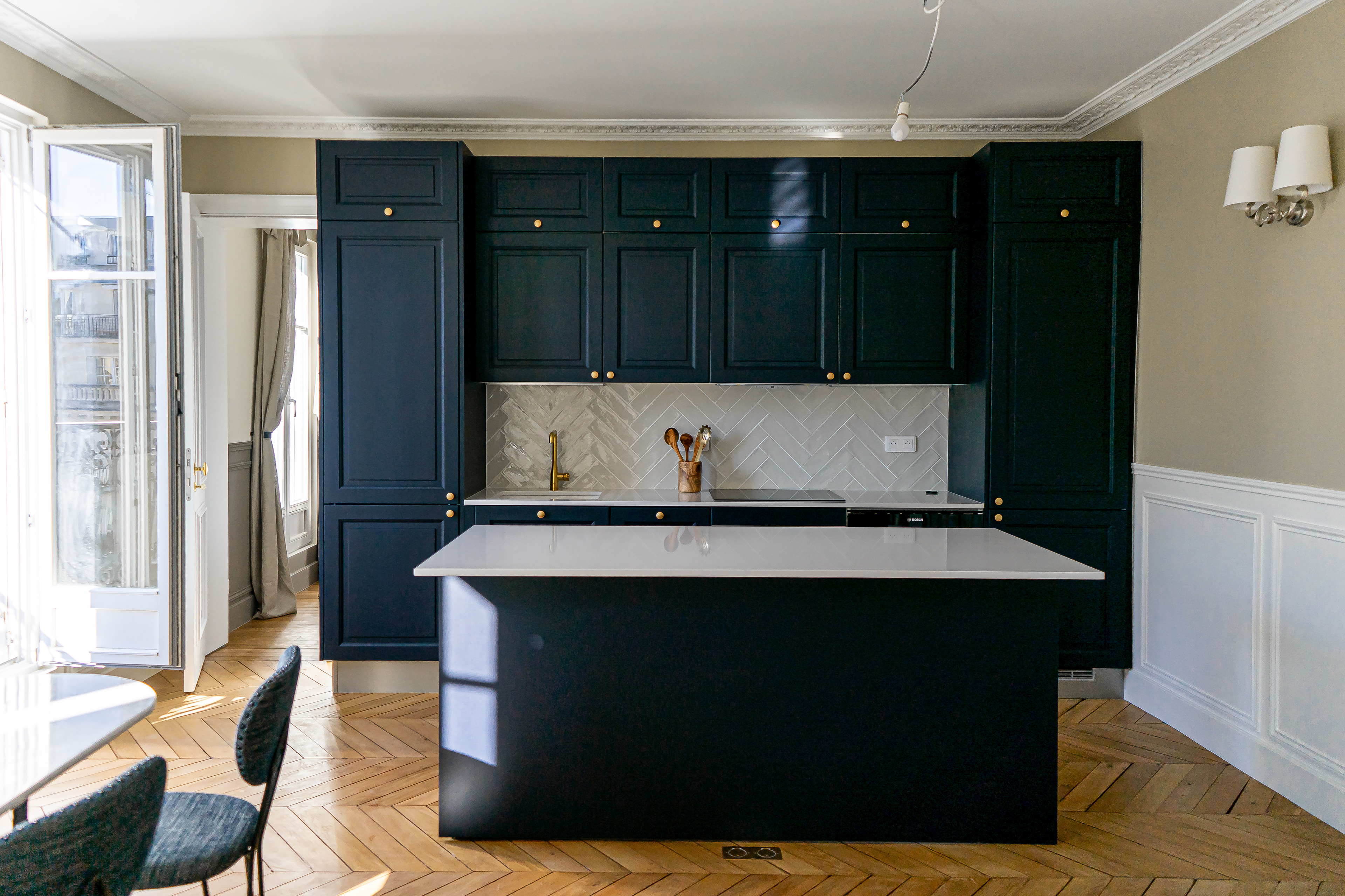 A 115 m² apartment in the center of the 7th arrondissement of Paris with a view of the Eiffel Tower and the École Militaire. Commissioned by an American family who moved to Paris, the apartment was divided into two zones: a parental area and a children's area, ensuring maximum privacy for all. During the renovation, two bathrooms and two toilets were created. An open blue kitchen became a bright accent in the living room. The main task was to preserve the French authenticity of the apartment while adding modern and essential elements of everyday American life, such as double sinks in the bathrooms, air conditioners, and separate bathrooms for parents and children.