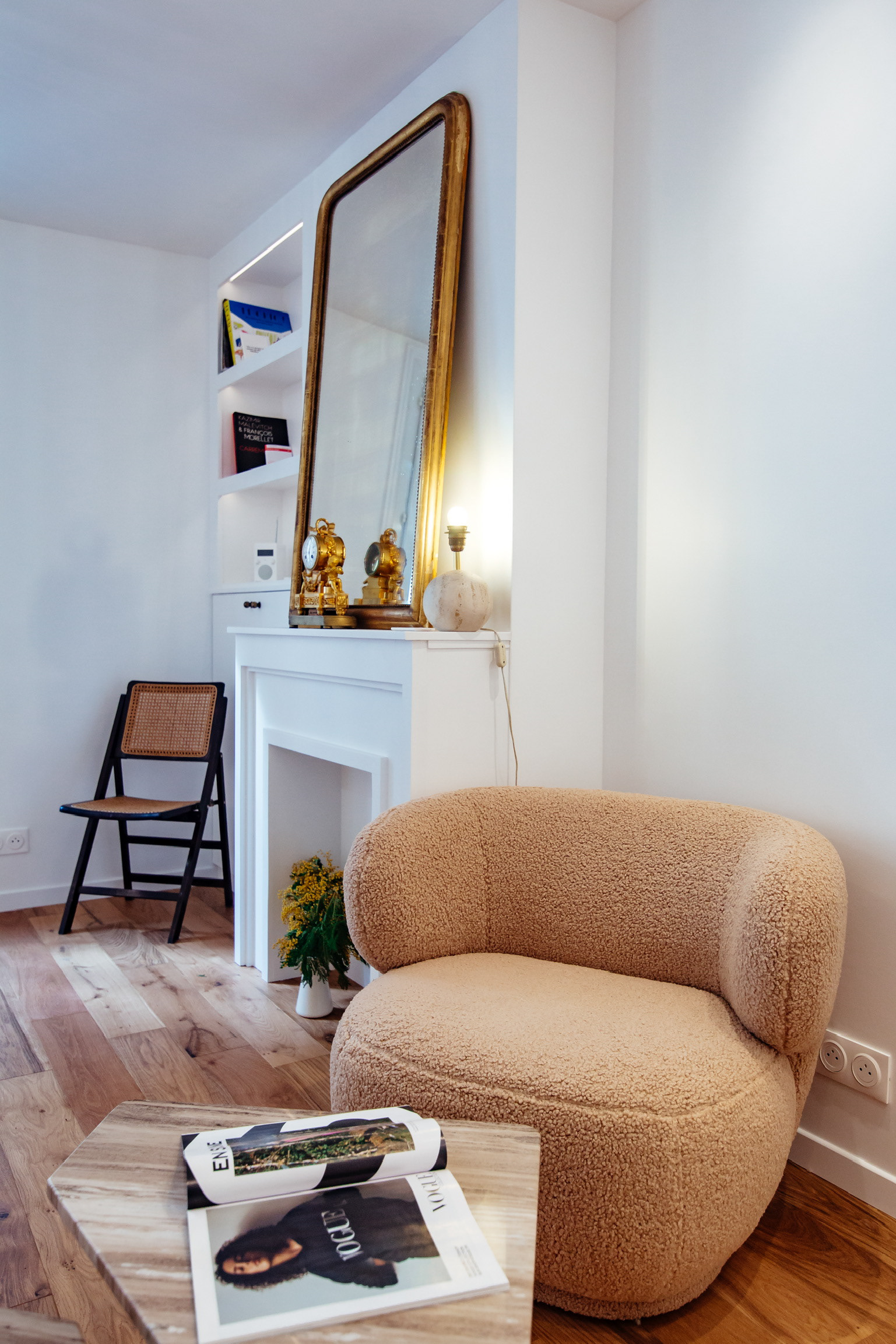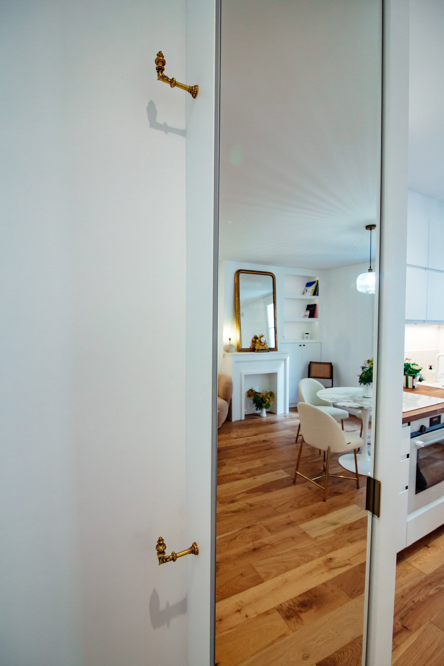 A complete renovation, expanding the space by removing the wall between the kitchen and the living room. Significant work was done with custom-made furniture due to the lack of standard sizes. A small niche was created in the bedroom, hidden by a handmade sliding door with a concealed mounting system and soundproofing. The bathroom, previously featuring a shower cabin, was fully renovated. Given the small size, much attention was paid to details to make the apartment inviting and interesting.